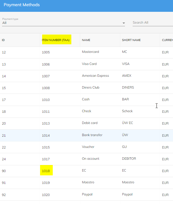 Dort geht es dann um die Item Nummer (TAA) der jeweiligen Zahlart: