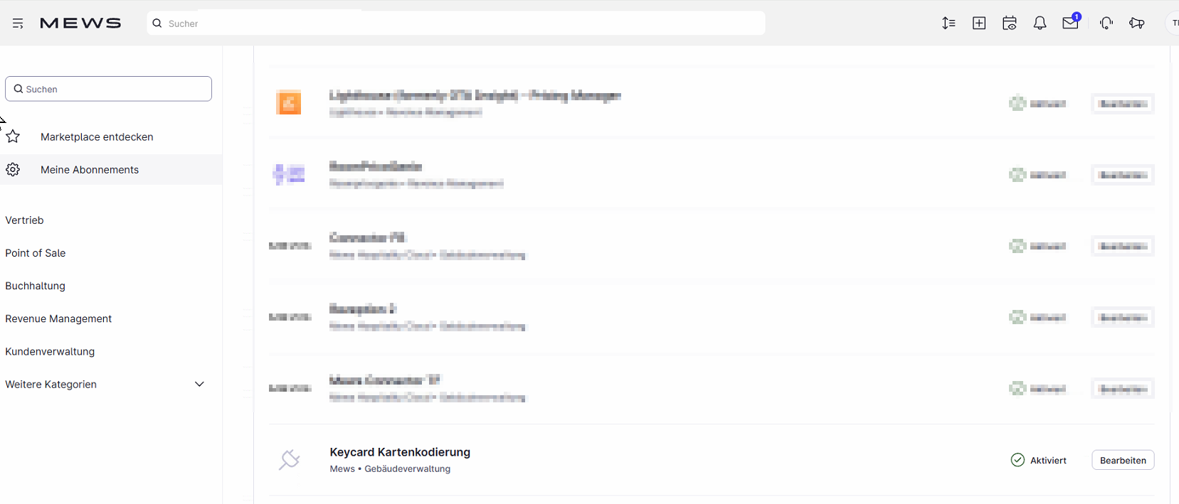 3) Im Mews Marketplace, unter "Keycard Kartenkodierung" wählen und auf bearbeiten klicken