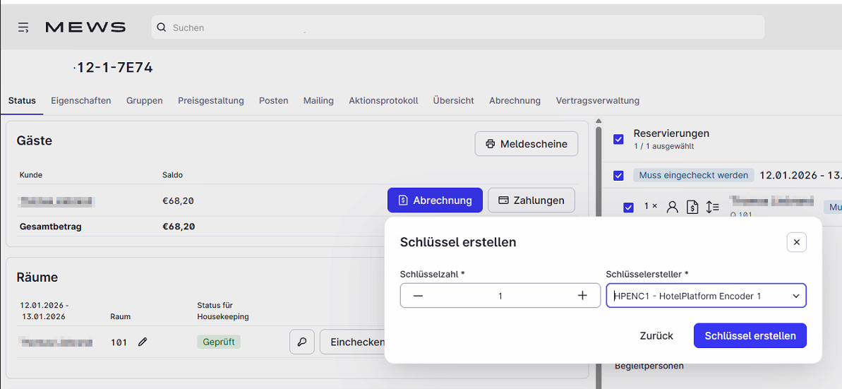 Um aus dem Mews PMS eine Schlüsselkarte über die HotelPlatfrom kodieren zu können gehen Sie wie folgt vor: